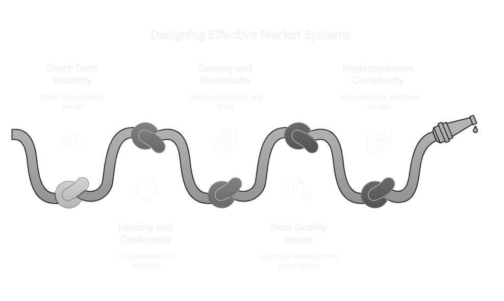 The biggest risk? Bad design. Poor weighting formulas or weak governance can actually increase bias instead of reducing it. A market system without proper guardrails ends up looking arbitrary and unfair – the exact opposite of what you're trying to build.